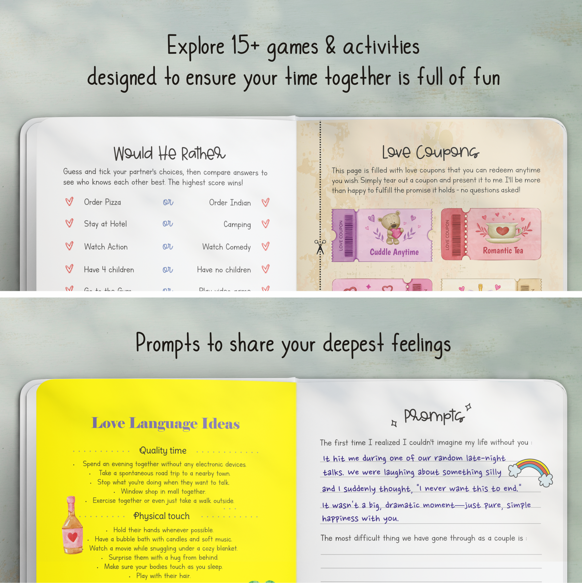 CREATE, LAUGH & PLAY TOGETHER — Enjoy games, quizzes, and creative activities that’ll have you laughing, reminiscing, and learning delightfully weird things about each other—like who’d survive longer in a zombie apocalypse.